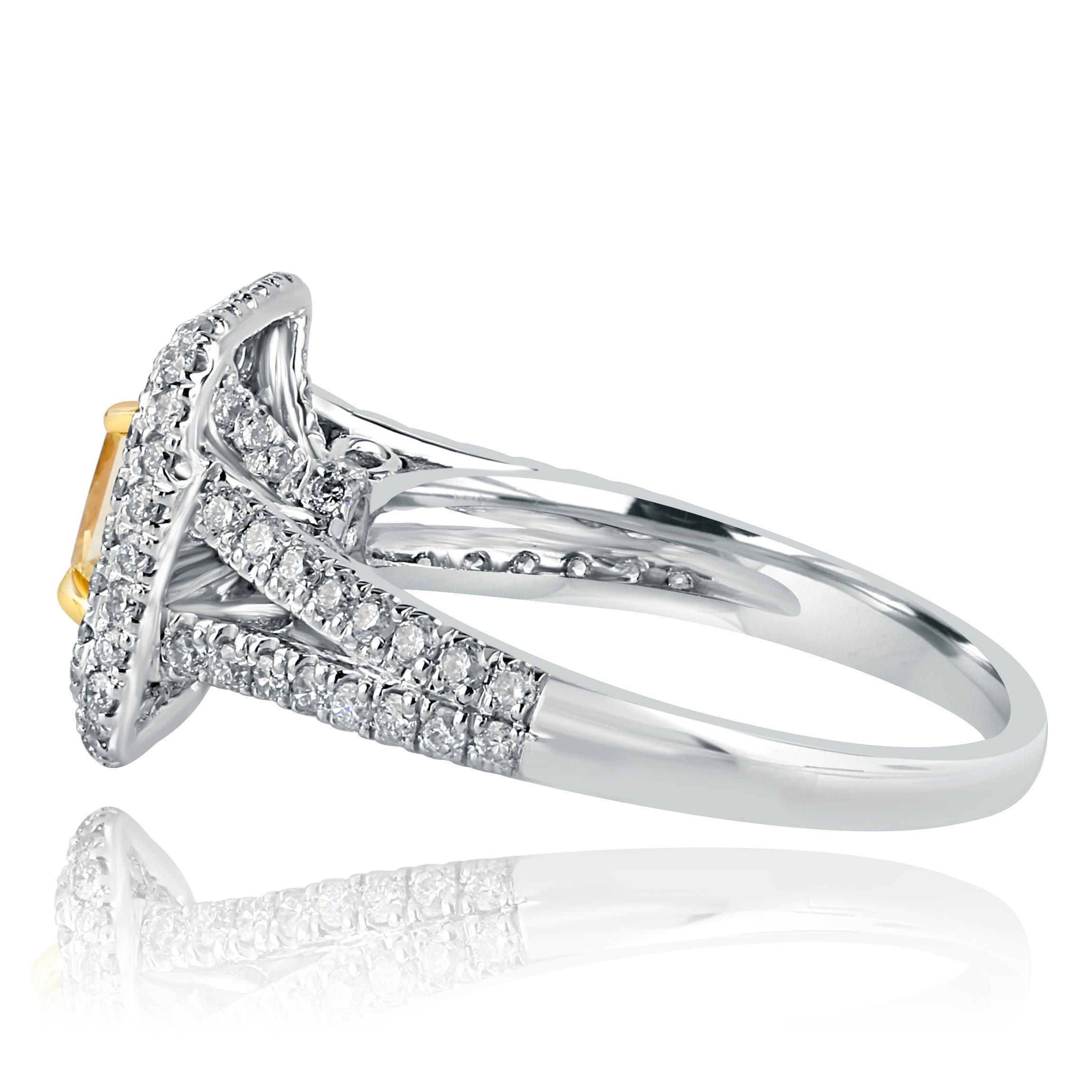 Magnificent diamond engagement ring features a 1.51 carat radiant cut diamond center embraced by perfectly matched half moon side diamonds. Additional round cut diamonds line the split shank and double halo adding an extra beauty to the ring. Total carat weight 2.76 Handcrafted in 18-karat white gold.
