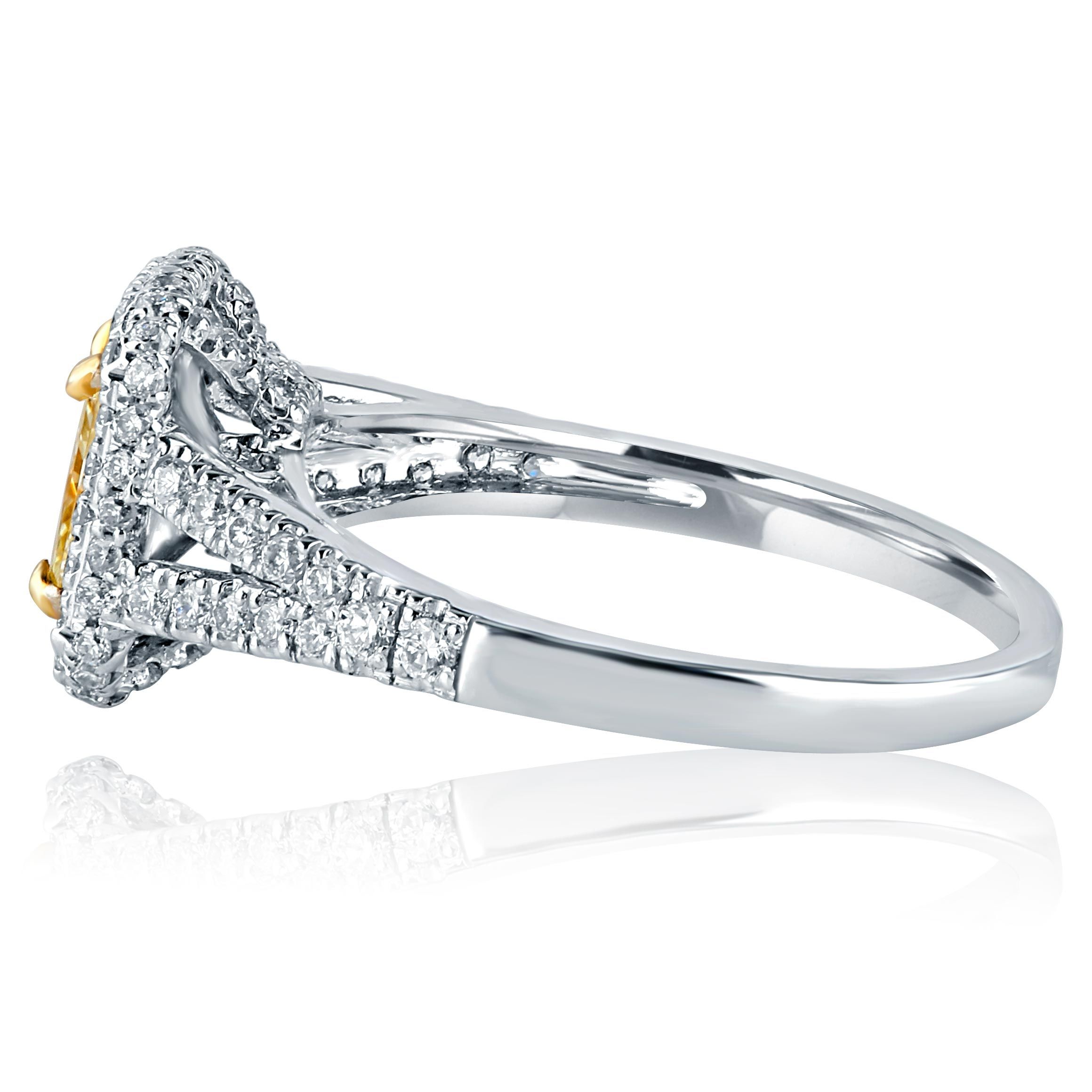 Crafted in 18-karat white gold, the ring showcases a 1.15 carat yellow (W - X Range) GIA certified radiant cut diamond in double halo of colorless round brilliant cut diamonds. The split shank with two light yellow trillion cut and colorless round cut diamonds complete a design. The center diamond has laser inscription #2173843349.
